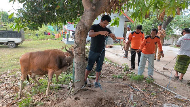 Di tengah proses pembangunan bantuan musholla di Kecamatan Kayangan, Kabupaten Lombok Utara, NTB yang sudah berlangsung selama dua pekan, bertepatan dengan Hari Raya Idul Adha, Tim MER-C juga mengadakan pemotongan hewan qurban. Hewan qurban sebanyak satu ekor sapi dipotong oleh relawan Divisi Konstruksi MER-C yang tengah bertugas di sana bersama dengan warga sekitar. Pemotongan dilakukan di SMPN 3 Kayangan pada hari Senin, 11 Juli 2022 dan daging qurban langsung dibagikan kepada para guru dan warga sekitar.