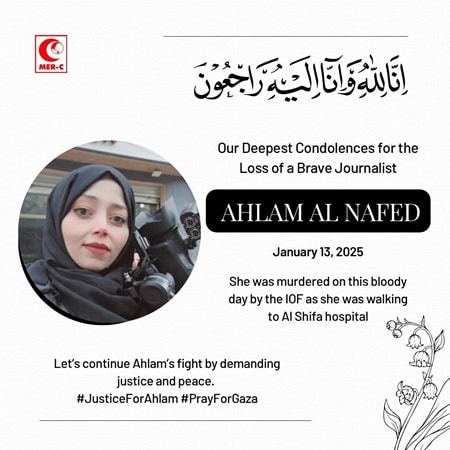 Inna lillahi wa inna ilaihi raji’unOur Deepest Condolences for the Loss of a Brave Journalist Ahlam courageously documented the genocide in north Gaza, residing in the Indonesia Hospital during its siege, taking evidence of war crimes and bearing witness to tell the story with her pictures and her words, many of which we shared with you here She was murdered on this bloody day by the IOF as she was walking to Al Shifa hospital The last message of Martyr Ahlam Al Nafed This is my duty to document all the attacks we are exposed to inside and outside the hospital so that the world can see the destruction we are exposed to by the occupation. And that we are innocent and not terrorists. We hope to God that the war will end, and that our message will reach the whole world about the injustice, destruction and genocide to which innocent people are being subjected. It is true that documentation and photography are a bit dangerous, but we do this so that the world can witness these crimes. ———– Ini adalah tugas saya untuk mendokumentasikan semua serangan yang kami hadapi di dalam dan luar Rumah Sakit sehingga dunia dapat melihat kehancuran yang kami hadapi akibat penjajahan. Bahwa kami tidak bersalah dan bukan teroris. Kami berharap kepada Allah agar perang ini berakhir, dan pesan kami akan sampai ke seluruh dunia tentang ketidakadilan, kehancuran, dan genosida yang dialami orang-orang yang tidak bersalah. Memang benar bahwa dokumentasi video dan foto-foto mengancam jiwa kami, tetapi kami (tetap) melakukannya agar dunia dapat menyaksikan kejahatan ini.
