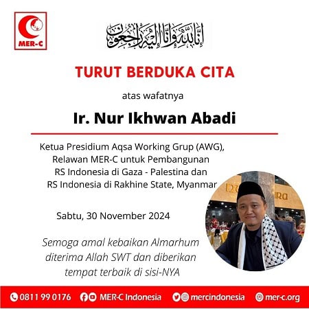 Innalillahi wainnailaihi rajiun, (Sesungguhnya kami milik Allah, kepada-Nya kami kembali). Medical Emergency Rescue Committee (MER-C) menyampaikan belasungkawa sedalam-dalamnya atas meninggalnya Ir. Nur Ikhwan Abadi (Ketua Presidium Aqsa Working Grup/ AWG) pada tanggal 30 November 2024. Sebelumnya, Ir. Nur Ikhwan Abadi menjadi relawan MER-C untuk pembangunan Rumah Sakit Indonesia di Gaza dan Rumah Sakit Indonesia di Rakhine State, Myanmar. Semoga Allah SWT mengampuni segala dosanya dan menerima amal ibadahnya ————————————————————— Innalillahi wainnailaihi rajiun,(From Allah we belong, to Him we shall return). Medical Emergency Rescue Committee (MER-C) expresses our deep condolences on the passing of Eng. Nur Ikhwan Abadi (Chairman of the Aqsa Working Group Presidium) on November 30th, 2024. Previously Eng. Nur Ikhwan Abadi was volunteering with MER-C for the construction of the Indonesia Hospital in Gaza and Indonesia Hospital in Rakhine State, Myanmar. May Allah SWT forgive all his sins and accept his good deeds.