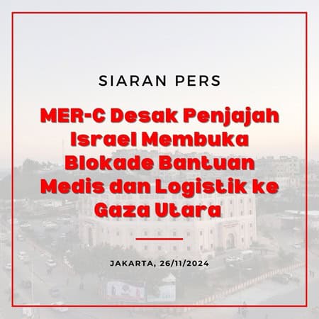 Sejak perintah evakuasi paksa yang dikeluarkan oleh penjajah pada awal Oktober 2024, maka seluruh relawan MER-C meninggalkan RS Indonesia dan wilayah Gaza Utara menuju ke posko MER-C di Deir al-Balah, Gaza Tengah. Hingga kini, pengepungan dan pennyerangan di Gaza Utara terus berlangsung, menargetkan kamp pengungsian warga dan rumah sakit Kamal Adwan yang masih beroperasi. Sedangkan Rumah Sakit Indonesia telah di blokade dengan dipasangnya check point disekitar jalan masuk. Rakyat palestina yang terluka dan sakit akibat blokade serta penyerangan penjajah juga tidak mendapatkan pertolongan kesehatan yang layak karena rumah sakit telah kehabisan bahan bakar, dirusak sumber oksigen, listrik, dan suplai obat di stop. Rakyat Palestina lainnya harus berjuang ditengah kondisi kelaparan, risiko penyakit menular karna rusaknya suplai air bersih, sistem limbah, dan musim dingin Tenaga medis lokal, dengan panggilan kemanusiaan dan rasa tanggung jawab profesional, tetap bertahan memberikan pelayanan kepada pasien yang membutuhkan. Hal ini dilakukan meskipun banyak dari sejawat mereka telah menjadi korban serangan, syahid, terluka, atau ditangkap. MER-C Indonesia terus berupaya mengirimkan relawan medis dan bantuan kemanusiaan ke Jalur Gaza. Saat ini, sebanyak tujuh relawan yang tergabung dalam Tim EMT MER-C ke-6 masih berada di Gaza City, bertugas di dua rumah sakit, yaitu RS Al Shifa dan Public Aid Hospital. Tim EMT MER-C ke-6 telah berulang kali mengajukan izin melalui WHO untuk masuk ke wilayah Gaza Utara yang terkepung. Namun hingga kini, penjajah belum memberikan izin bagi tim medis internasional untuk membantu pelayanan di RS Indonesia dan RS Kamal Udwan. Mempertimbangkan situasi di lapangan khususnya Gaza Utara yang terus memburuk, MER-C Indonesia Mendesak Penjajah Israel untuk: 1. Membuka blokade agar Tim Medis Internasional masuk ke Gaza Utara, khususnya ke RS Indonesia dan RS Kamal Udwan 2. Membuka blokade agar bantuan logistik kemanusiaan masuk ke Gaza Utara; 3. Menghentikan penyerangan terhadap RS Kamal Udwan di Gaza Utara dan membuka blokade terhadap RS Indonesia 4. Menghentikan serangan militer terhadap tenaga kesehatan yang sedang bertugas, dan membebaskan tenaga kesehatan yang ditahan Komunitas Internasional harus terusMemberikan tekanan guna menghentikan pembantaian dan membuka blokade Gaza utara oleh penjajah untuk mencegah kematian massal. Jakarta, 26 November 2024 ———————————————————————————————————————————- Press Release MER-C Urges the Israel Occupation to Open Blockade of Medical Aid and Logistics to Northern Gaza Since the latest forced evacuation order issued by the occupation in early October 2024, all of the MER-C’s volunteers had left the Indonesia Hospital and any area of Northern Gaza, then headed to the MER-C post centre in Deir al-Balah, the Central of Gaza. To this day, the siege and attacks in the North of Gaza have continued, targeting refugee camps, and the Kamal Adwan Hospital, which is now still operating. Meanwhile, the Indonesia Hospital has been blockaded with several checkpoints installed at vicinity of the hospital. Palestinian injured people and sick could not receive proper medical assistance because the hospital has been damaged, and run out of fuel, oxygen sources, and electricity, also the supply of medicine has been stopped, all due to the blockade and attacks by the occupation. Another displaced person, have to struggle amidst the conditions of hunger, and the risk of infectious diseases due to the damage through the supply of clean water, sewage systems, and winter. Local medical health workers, with their call to humanity and their sense of professional responsibility, continue to provide services to patients in need. This has been done even though many of their colleagues at work have become victims of attacks, martyrs, injured, or arbitrary detention. MER-C Indonesia continues striving to send medical volunteers and humanitarian aid to the Gaza Strip. Currently, seven volunteers – 5 among them are medical team, still working in two hospital namely Al Shifa Hospital and Public Aid Hospital. The 6th EMT Team from MER-C has repeatedly applied for permissions through the WHO to enter the besieged Northern Gaza region. However, to this very day, the occupation has not given any permission for an international medical team to assist in services at the Indonesia Hospital and the Kamal Adwan Hospital. Considering the situation on the ground, especially in the North of Gaza which continues to worsen, MER-C Indonesia urges the Occupation of Israel to:1. Open the blockade for the International Medical Team to be able to enter and working in the North of Gaza, especially the Indonesia Hospital and Kamal Adwan Hospital. 2. Open the blockade of humanitarian logistical aid and for them to be able to enter the North of Gaza; 3. End all military campaign to health facilities and staffs, and release those who have been detained. 4. End the military attacks towards the on-duty health workers, and release the detained medical personnel. The international community must continue on putting pressure to stop the massacre, open the blockade of Northern Gaza by the occupation, and prevent the mass killing of civilians. Jakarta, November 26th, 2024