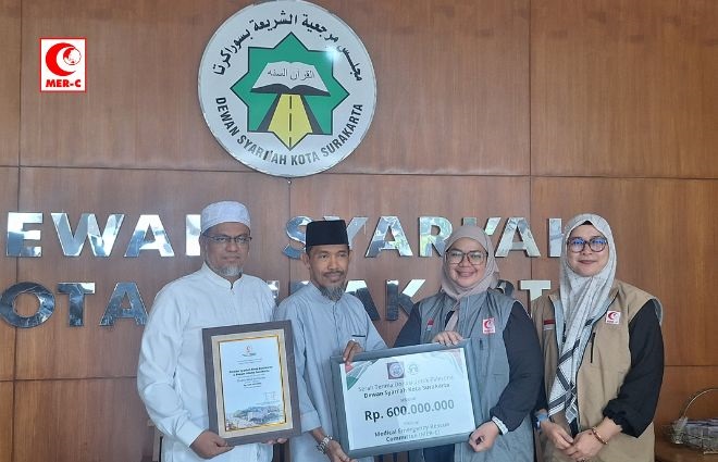 Surakarta — Dewan Syari’ah Kota Surakarta (DSKS) menyerahkan donasi kemanusiaan sebesar Rp600 juta untuk rakyat Palestina kepada Medical Emergency Rescue Committee (MER-C) pada Jumat pagi, 9 Mei 2025.