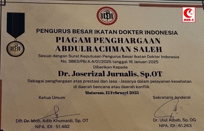Jakarta – Pengurus Besar Ikatan Dokter Indonesia (IDI) memberikan penghargaan Abdulrachman Saleh kepada Pendiri Medical Emergency Rescue Committee (MER-C) Almarhum dr. Joserizal Jurnalis, Sp.OT.