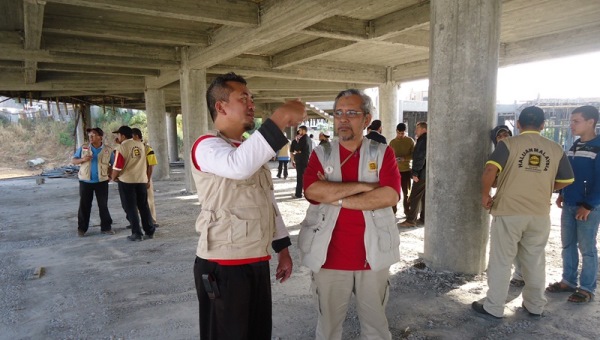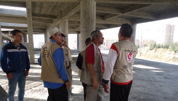 GAZA, PALESTINA Sebanyak 11 orang dari LSM Haluan Malaysia mengunjungi lokasi pembangunan Rumah Sakit Indonesia (RSI) di Jalur Gaza, Palestina, Sabtu (28/4). Delegasi yang dipimpin oleh Dr. Syed Muhamad Haleem ini menyatakan kekagumannya kepada bangunan RSI .