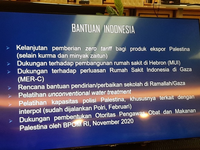 Sementara itu, Duta Besar Palestina untuk Indonesia, DR. Zuhair Al Shun menyampaikan penghargaan atas posisi dan dukungan pemerintah serta rakyat Indonesia terhadap Palestina. “Kami benar-benar bangga dengan Indonesia dan posisi yang dilakukan oleh negara tercinta ini. Kami sangat yakin bahwa Indonesia akan tetap dan terus mendukung semua warga Palestina sampai Jerusalem merdeka.”