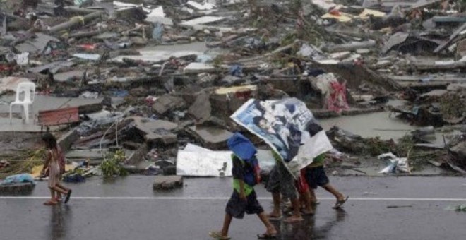 Warga menggunakan terpal untuk melindungi mereka dari hujan saat topan melanda kota Tacloban di provinsi Leyte, Filipina tengah, Ahad (10/11). (AP/Bullit Marquez)