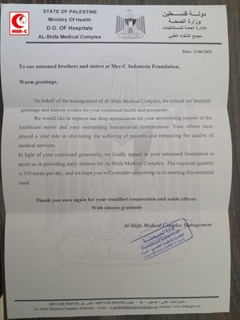 “Kami menyampaikan terima kasih kepada MER-C Indonesia atas upaya yang penuh berkah ini dalam mendistribusikan makanan untuk 350 staf RS As Shifa selama lima hari. Menyediakan makanan ini menjadi sangat sulit, bahkan nyaris tidak mungkin, dalam situasi yang penuh tantangan ini, ” kata perwakilan dari manajemen RS As Shifa.