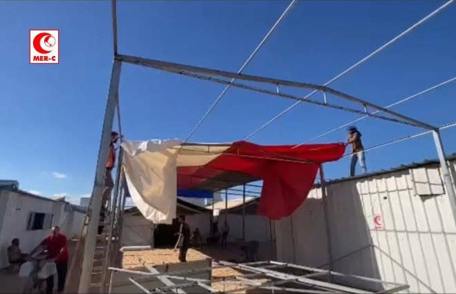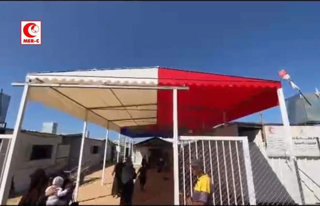 - Konstruksi kanopi logam berwarna merah putih di atas klinik (110 m²), sebagai perlindungan bagi pasien dari sinar matahari dan hujan, sekaligus menjadi simbol kehadiran dan solidaritas Indonesia di tengah masyarakat Gaza.