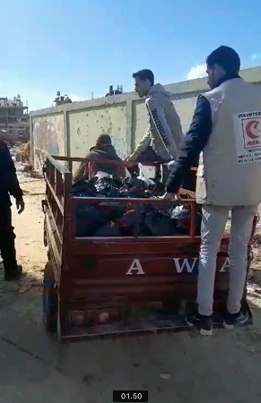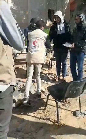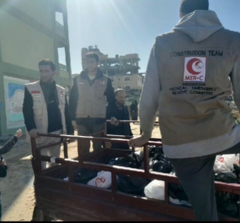 “Kami sekarang berada di depan Rumah Sakit Indonesia. Saat ini kami dalam proses pembagian bantuan kemanusiaan yaitu berupa makanan siap saji,” kata salah satu relawan MER-C.