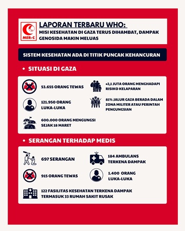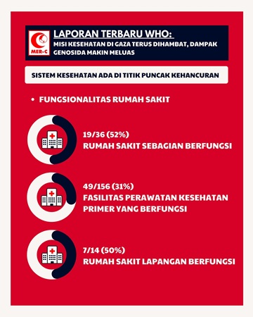 WHO juga memaparkan dampak genosida Israel yang meluas di Jalur Gaza: korban jiwa dan luka terus bertambah, fasilitas kesehatan hancur, kelaparan dan malnutrisi meningkat tajam. Blokade juga memperburuk kondisi kemanusiaan dalam jangka panjang.