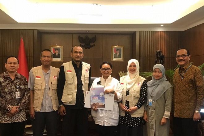 Menlu Retno Marsudi (empat dari kiri) saat menerima delegasi yang dipimpin Ketua Presidium MER-C dr Sarbini Abdul Murad (tiga dari kiri) saat melaporkan perkembangan pembangunan Rumah Sakit Indonesia (RSI) Tahap II di Gaza, dan RSI di Myanmar. (FOTO ANTARA/HO-Humas MER-C/2019)