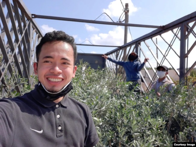 Fikri Rafi’ul Haq dalam salah satu kegiatan sebagai relawan di Gaza, mengantar dan menanam pohon zaitun, salah satu sumber nafkah rakyat Palestina. (foto: courtesy)