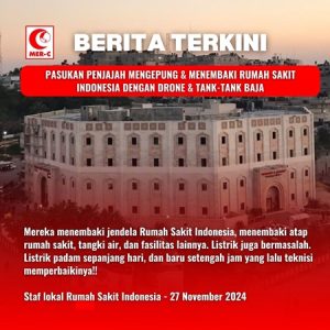 Tiga rumah sakit di Gaza Utara telah dikepung selama lebih dari 80 hari. Selama periode ini, Tim Emergency Medical Team (EMT) MER-C Indonesia telah memberikan bantuan di RS Kamal Adwan, dimana para relawan menyaksikan serangan hebat di lokasi tersebut. Untuk masalah keamanan, mereka akhirnya terpaksa meninggalkan RS tersebut.