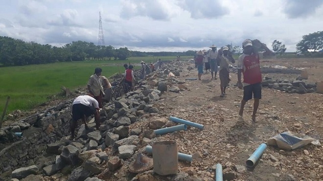 Meski kerap dilanda hujan lebat, pembangunan tahap infrastruktur berupa pengurukan dan pemagaran lahan RS Indonesia seluas lebih dari 7.000 m2 di Mrauk U, Rakhine State, Myanmar terus berjalan.