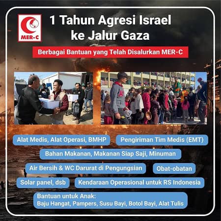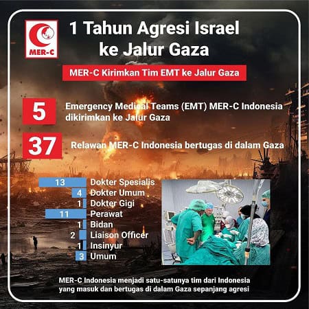 Satu tahun genosida di Gaza, Palestina, menyebabkan kesehatan masyarakatnya tidak hanya rentan, namun juga semakin terabaikan, oleh karena itu, sejak Maret 2023, MER-C secara konsisten mengirimkan lima gelombang Emergency Medical Team (EMT) ke dalam Gaza secara resmi melalui kerjasama dengan World Health Organization (WHO), dan berkomitmen untuk melanjutkan pengiriman tim ke-6 khususnya mengelola kasus-kasus medis di daerah perang. Total 37 relawan MER-C Indonesia, terdiri atas dokter spesialis, dokter umum, perawat, bidan, Liaison Officer dan relawan logistik umum telah melakukan rotasi di dalam Gaza sampai 7 Oktober 2024.