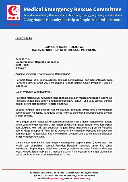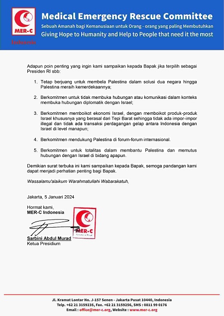 Dalam surat terbuka ini, kami ingin mengingatkan kepada para Capres agar jika terpilih dan ditakdirkan menjadi Presiden Republik Indonesia untuk lima tahun mendatang, Bapak dapat melakukan upaya yang lebih terhadap Palestina dan juga tegas kepada Israel baik politik maupun ekonomi. Ketegasan ini sangat dibutuhkan ketika dunia Arab semakin mesra dengan Israel.